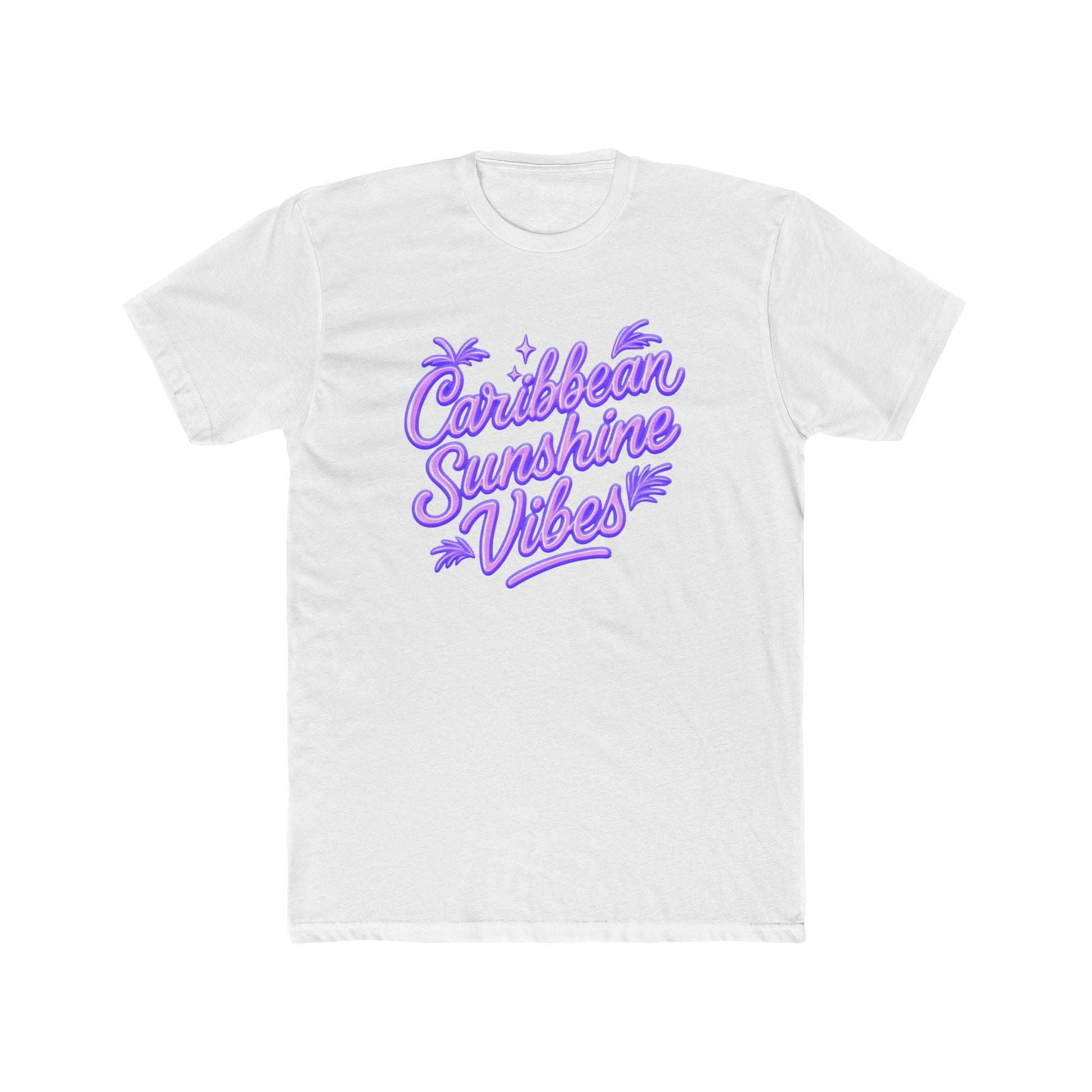 Lightweight and breezy, this cotton crew tee carries a sunlit, beachside energy. A soft white canvas showcases a playful lavender script that reads “Caribbean Sunshine Vibes,” edged with tiny palm motifs—like a postcard you can wear. The fit sits classic and relaxed, with a ribbed collar and shoulder tape that keep the shape through many trips to the shore or errands around town. Throw it on with shorts or layer it under an open shirt for late-afternoon bonfires and weekend market strolls. It feels effortless, easy to move in, and gently nostalgic—the kind of tee that brings a touch of island calm to everyday life. Caribbean Sunshine Vibes Tee — Retro Tropical Graphic T-Shirt.
